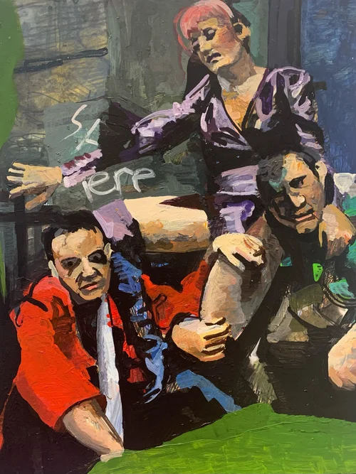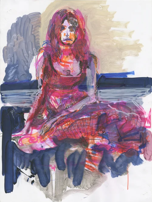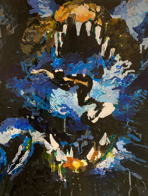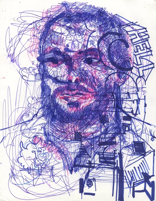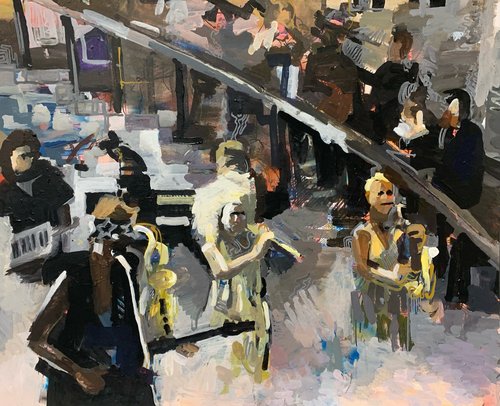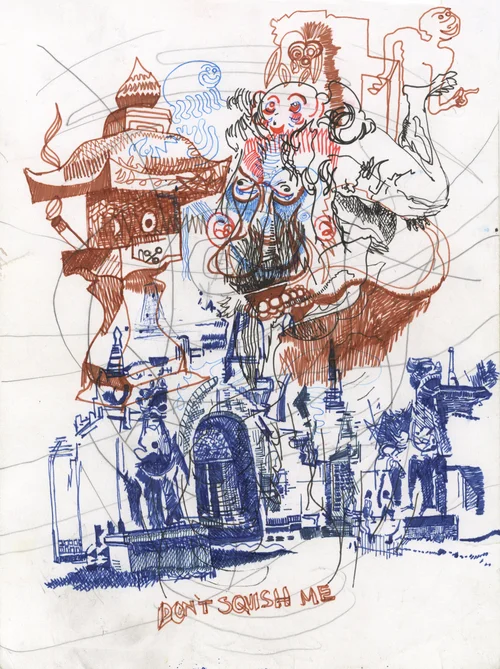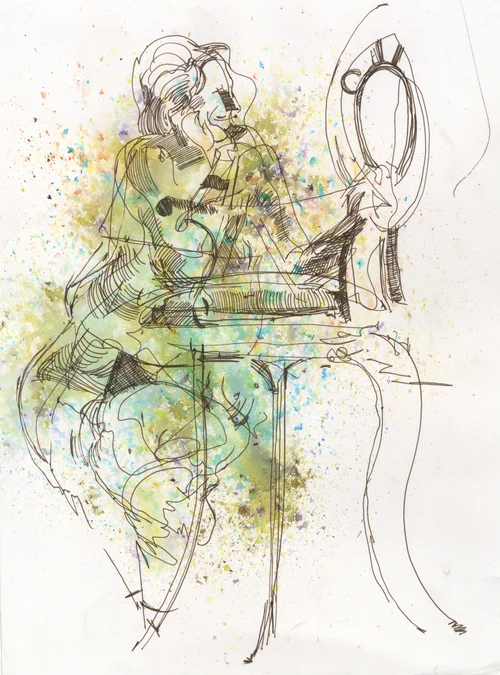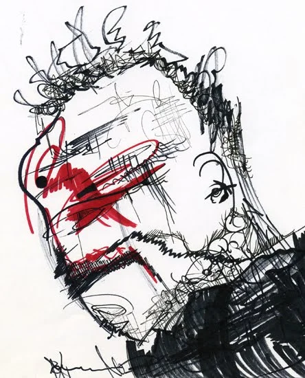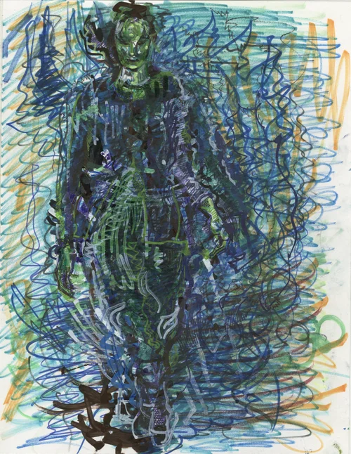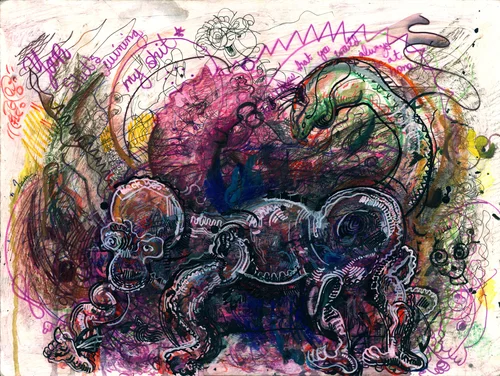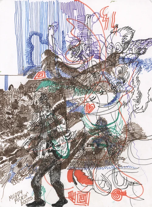 Think of these as neither painting nor drawing but a hybrid of the two. Pen and ink on drums, watercolors on bass guitar, air brush on synthesizer, acrylic paint on lead guitar, paint marker on vocals.