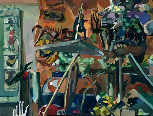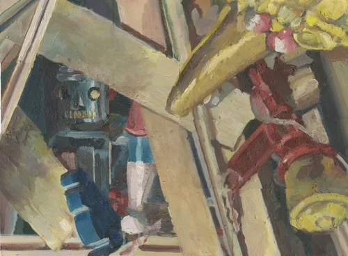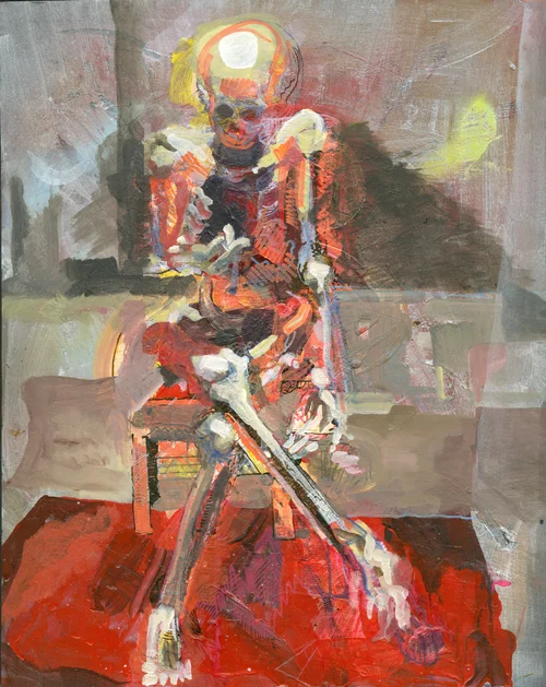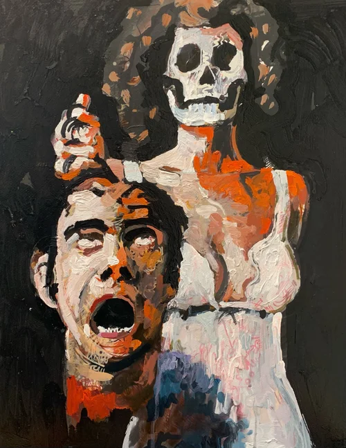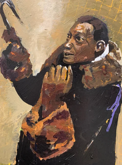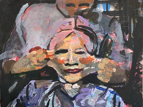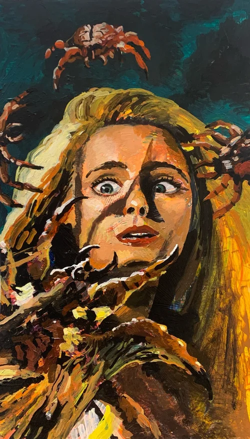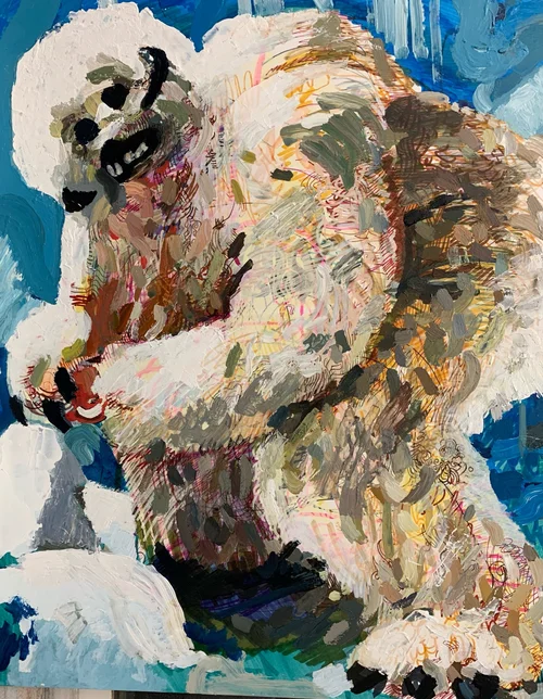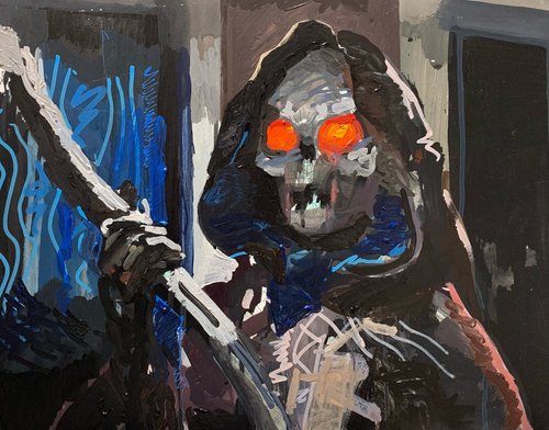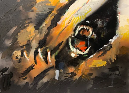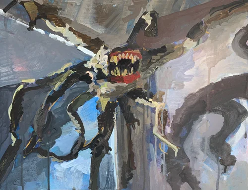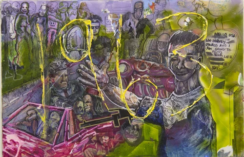Think of these as neither painting nor drawing but a hybrid of the two. Pen and ink on drums, watercolors on bass guitar, air brush on synthesizer, acrylic paint on lead guitar, paint marker on vocals.